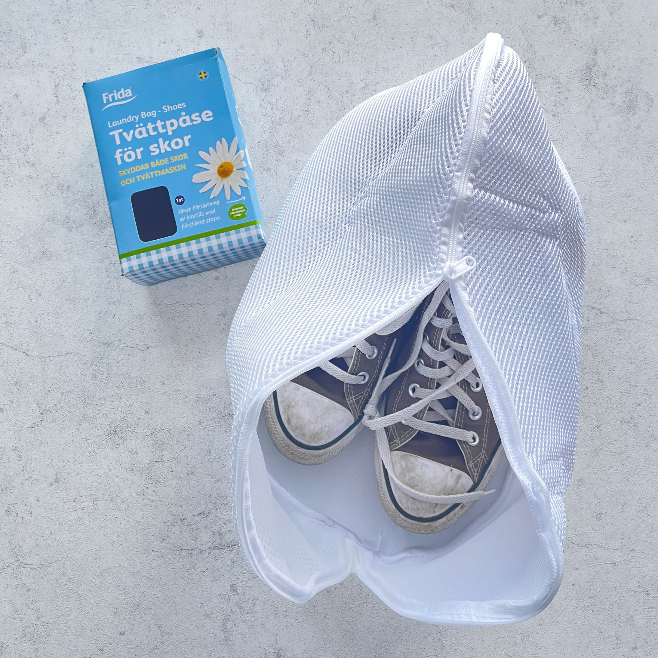 Med Fridas speciellt framtagna tvättpåse för skor skyddar du tvättmaskinen och din övriga tvätt. Samtidigt som tvättmedlet kommer åt att göra skorna rena och fina.
